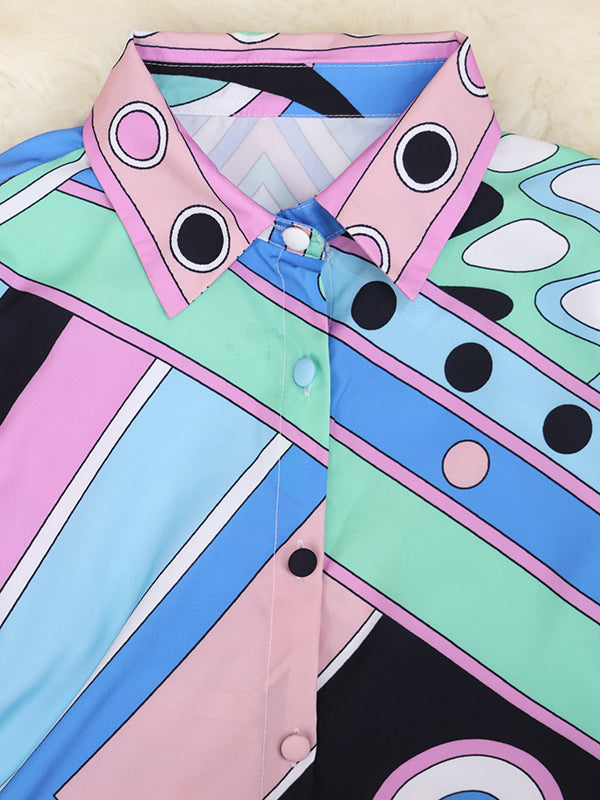 Long Sleeves Buttoned Contrast Color Printed Lapel Blouses&Shirts Tops + Pleated Bodycon Skirts Bottom Two Pieces Set