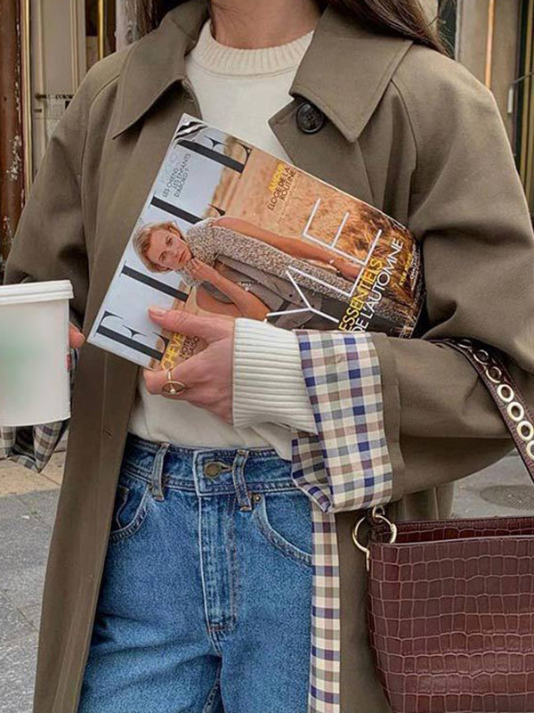 Long Sleeves Loose Buttoned Plaid Split-Joint Lapel Outerwear Trench Coats