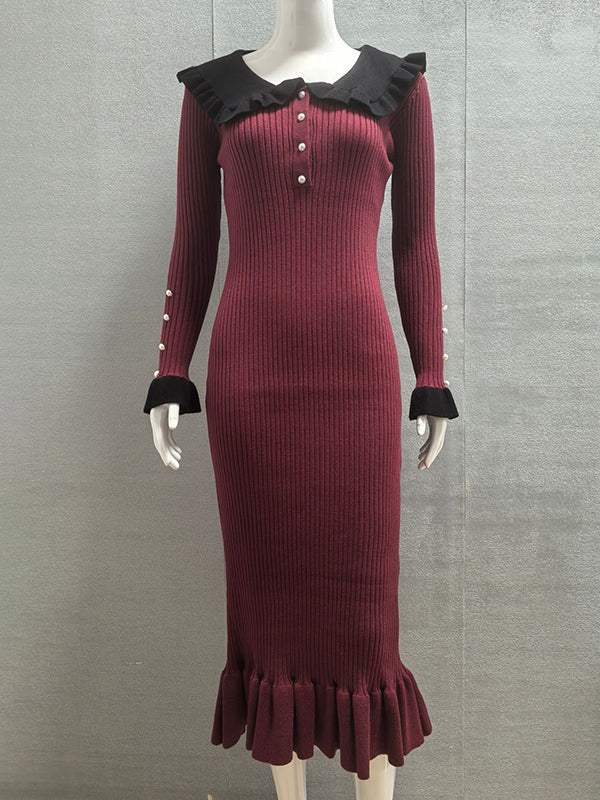 Long Sleeves Pleated Ruffled Split-Joint Peter Pan Collar Midi Dresses Sweater Dresses